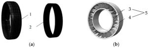 برخی تحقیقات نیز بر روی اتلاف حرارت و طراحی کاهش وزن اینسرتها تمرکز دارند. زنگ و همکاران ساختار ترکیبی ISRFT را همانطور که در شکل 3 نشان داده شده است، پیشنهاد کردند . این ساختار از طراحی استاندارد رینگ استفاده کرده، یک شیار اتلاف حرارت به سطح خارجی اینسرتها اضافه کرده و شیار کاهش وزن را در هر دو طرف طراحی کرده است. مزایای آن ساختار ساده شده و کاهش هزینهها است. اینسرتهای سنتی مشکلاتی مانند وزن زیاد و ممان اینرسی زیاد داشتند.