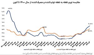 با شروع تابستان تورم نقطهای تولیدکننده به سطوح بیش از ۴۰درصد وارد شد. در تیرماه ۴۱.۹درصد، در مردادماه ۴۴.۲و در شهریورماه تورم نقطهبهنقطه تولیدکننده ۴۸.۶درصد ثبت شد. با شروع پاییز تورم تولیدکننده به سطوح جدید بیش از ۵۰درصد وارد شد. در مهرماه تورم نقطهبهنقطه تولیدکننده به ۵۴.۲درصد رسید. تورم ماهانه تولیدکننده نیز در مهرماه افزایش قابلتوجهی را ثبت کرد و ۶.۲درصد ثبت شد. تورم ماهانه تولیدکننده بیش از ۶درصد، پیش از این در خردادماه سال قبل گزارش شده بود. تورم ماهانه تولیدکننده در دو ماه بعدی پاییز سال جاری به زیر ۵درصد کاهش یافت، به طوری که در دو ماه آبان و آذرماه، تورم ماهانه ۴.۷درصد ثبت شد. تورم نقطهبهنقطه تولیدکننده نیز در آبانماه ۵۷.۶درصد و در آذرماه به ۶۰.۶درصد رسیده است.