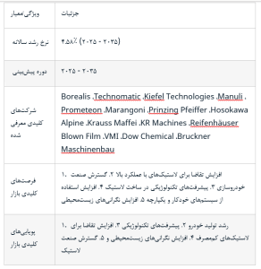 پیشبینی میشود که صنعت جهانی ماشینآلات ساخت تایر به طور قابل توجهی رشد کند و برآوردها نشان میدهد که ارزش بازار تا سال ۲۰۳۵ نرخ رشد مرکب سالانه پیشبینیشده ۴.۵۹ درصدی را نشان دهد که مبین چشمانداز قوی بازار ناشی از نوآوریهای مداوم و گسترش قابلیتهای تولید است. با تطبیق صنعت با تغییر ترجیحات مصرفکننده و الزامات نظارتی، بازار برای رشد پایدار آماده است و فرصتهایی را برای ذینفعان در سراسر زنجیره ارزش ارائه میدهد.