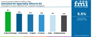 فروش سیلیس ویژه اتحادیه اروپا رشد قابل توجهی را در اقتصادهای بزرگ اروپایی نشان میدهد، به طوری که با نرخ رشد مرکب سالانه ۶.۱ درصد تا سال ۲۰۳۵، پیشرو در این بخش خواهند بود که ناشی از تولید خودرو و توسعه صنایع شیمیایی نوظهور است. آلمان از طریق تمرکز ثابت در تولید تایر و زیرساختهای جامع صنعت شیمیایی، رهبری خود را حفظ میکند. فرانسه از صنایع متنوع خودرو و پوشش بهرهمند است. ایتالیا از تولید پایدار تایر و کاربردهای دارویی رو به رشد بهره میبرد. اسپانیا با گسترش توسعه بخش تولید خودرو و پوشش، رشد قوی را نشان میدهد. هلند بر تمرکز در تولید مواد شیمیایی و برتری لجستیکی تأکید دارد.
