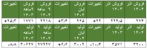 بر اساس اطلاعات مندرج در سامانه کدال، این شرکت در آذر ماه در مقایسه با آبان رشدی معادل 6.6 درصد را در تولید و رشد 3.4 درصدی فروش را ثبت کرده است، در حالیکه در قیاس با آذر ماه سال قبل میزان تولید 10.4 درصد کاهش یافته و میزان فروش نیز 22 درصد افزایشی گزارش شده است.