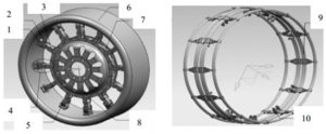 شکل ۱۳. چرخ ME جدید برای یک وسیله نقلیه چرخ‌دار خاص: ۱. لولای ۱، ۲. لولای ۲، ۳. لولای ۳، ۴. گروه لولا، ۵. شفت پین، ۶. حلقه بیرونی چرخ، ۷. فنر برگشتی، ۸. توپی، ۹. حلقه الاستیک، ۱۰. گیره ترکیبی حلقه الاستیک.
