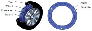 تیم تحقیقاتی پروفسور ژائو یوکون از دانشگاه هوانوردی و فضانوردی نانجینگ، یک طرح طراحی ارائه داد. این طرح یک چرخ ایمنی ME با ساختار غیر پنوماتیکی است، همانطور که در شکل 12 نشان داده شده است . این طرح عمدتاً از سه بخش تشکیل شده است: چرخ الاستیک، گروه لولا و توپی سیستم تعلیق. از خاصیت ارتجاعی ساختار مکانیکی برای جایگزینی خاصیت ارتجاعی تورم لاستیک در لاستیک‌های پنوماتیک سنتی استفاده می‌شود. بر اساس برآورده کردن عملکردهای لازم لاستیک‌های پنوماتیک، این طرح همچنین دارای ویژگی‌های مقاومت در برابر ضربه، جلوگیری از آسیب و ظرفیت تحمل بالا است. نوآوری اصلی آن این است که ساختار یاتاقان نوع توپی و گروه حلقه-لولا الاستیک را به طور مشترک تغییر شکل می‌دهد. این مکانیسم تغییر شکل مشترک می‌تواند نقص‌های وابسته به فشار لاستیک‌های پنوماتیک سنتی را برطرف کند. علاوه بر این، می‌تواند تحمل پایدار و پاسخ دینامیکی را در شرایط کاری پیچیده محقق کند.